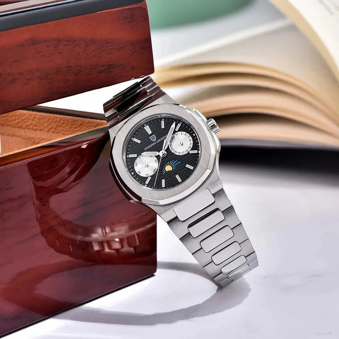 Function meets elegance with clear day-of-the-week and month windows, offering at-a-glance utility without clutter.